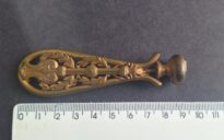 Sinete Voltar Documento MGD-01118.5 Baixar Metadados Miniatura Compartilhe DenominaçãoSineteColeçãoVictor BersaniResumo descritivoCarimbo/tipo com a letra A estlizada, podendo-se observar J, A e L, inicias de Joaquim Alegro de Lima, acoplado em cabo metálico (bronze) com adorno com ramos e uma lira.Número de registroMGD-01118.5Categoria7. Equipamento de comunicaçãoSubcategoria7.1 Equipamento de comunicação escritaData de produção1891DimensõesLargura: 2,6 cm Altura: 9 cm Profundidade: 1,7 cmMaterial/ TécnicaMetal (bronze)Estado de ConservaçãoRegular Continuar navegando Lapiseira – Suporte para grafite Abridor de cartas Voltar para a lista de itens